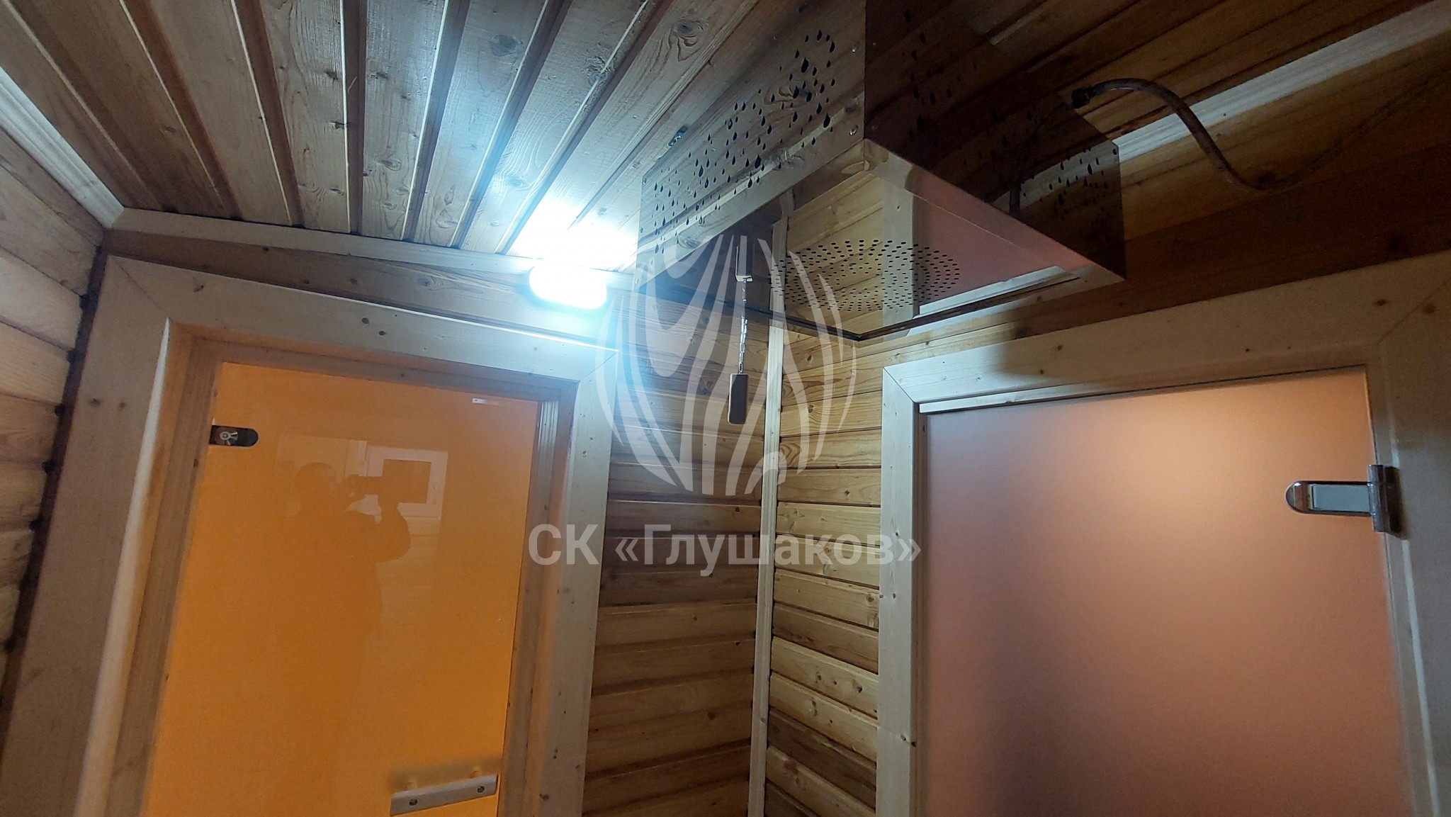 Внутри баня выполнена «под ключ» — всё готово к использованию: комната отдыха, помывочное помещение и уютная парная.